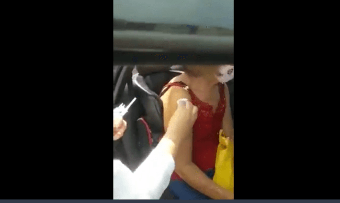 No atendimento drive thru, a enfermeira e familiares da idosa percebem no momento na aplicação que seringa está vazia.