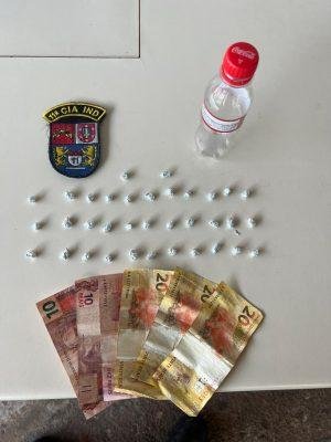 Durante o patrulhamento na área, conhecida pelo intenso comércio de drogas, a equipe policial identificou um indivíduo que, ao avistar a viatura, demonstrou nervosismo. O suspeito estava sentado em um estabelecimento (bar) e foi prontamente abordado pela equipe. Durante a busca pessoal, foram encontrados em seu bolso direito da calça um maço de cigarros contendo R$ 298,00 em dinheiro e 12 porções de uma substância análoga ao crack.