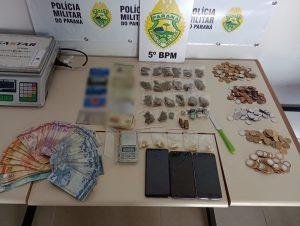 Com o apoio da equipe volante, verificou-se que o veículo de marca GM/Cobalt ao ser consultado o chassi não correspondia com a placa. Após verificação dos demais sinais identificadores, constatou-se que o citado é produto de furto em data do dia 03/01/2020, em Curitiba. Durante a busca pessoal no detido, foi localizado no bolso de sua calça a quantia em dinheiro em espécie no valor R$ 4.487,00.