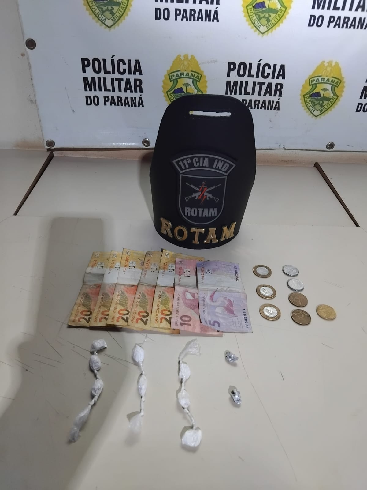 Ao perceberem a presença da viatura, um dos homens fugiu, tomando rumo ignorado. O outro foi abordado e, após busca pessoal, os policiais encontraram R$ 119,75 em dinheiro trocado em seu bolso, além de nove porções de cocaína escondidas em seu tênis e duas porções de crack em sua boca.